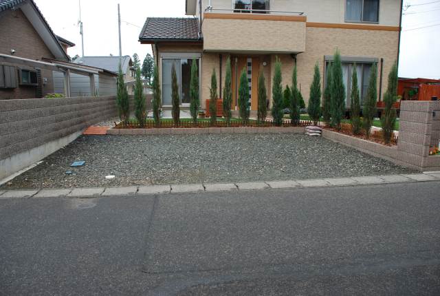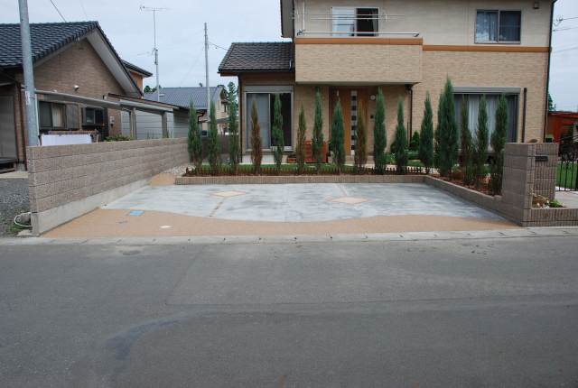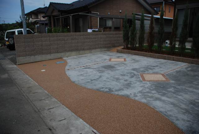 その結果天然石を部分的に使い、コンクリート仕上げとインターロッキングブロック