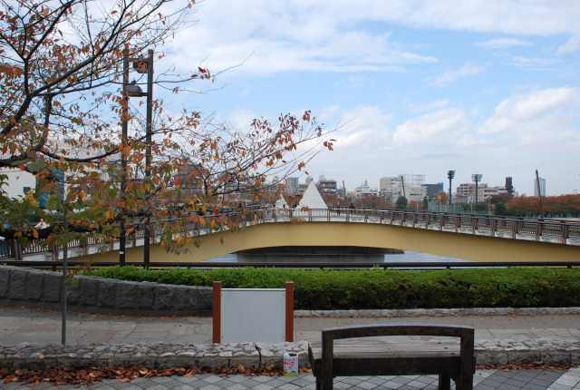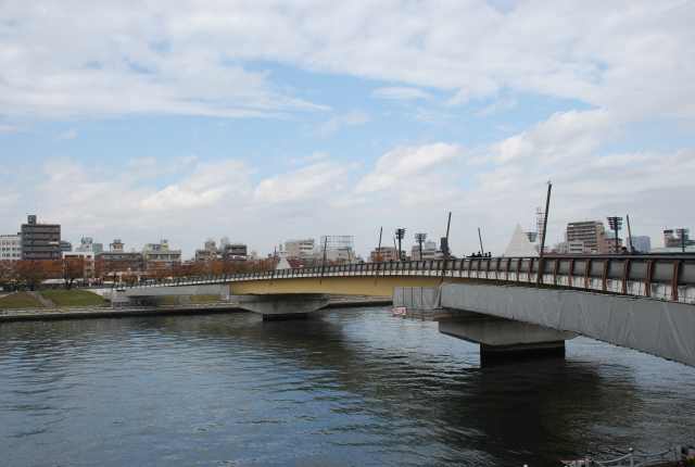 東側から見たスカイツリー。 スカイツリーを一周して再び浅草方面に向う。 ここは隅田川に架かる桜橋。 両端が二股になっているのが特徴です。